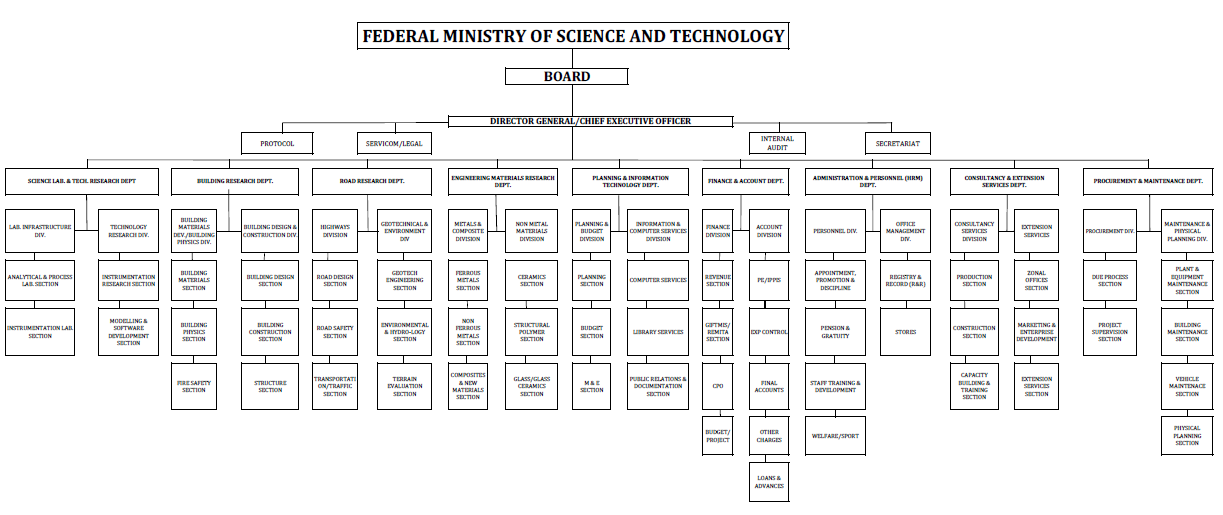 Nigerian Building and Road Research Institute (NBRRI) fosters a well-defined organizational structure to effectively conduct research, deliver services, and contribute to advancements in the construction and road sectors. Here's a breakdown of the key departments and their functions within the NBRRI organogram